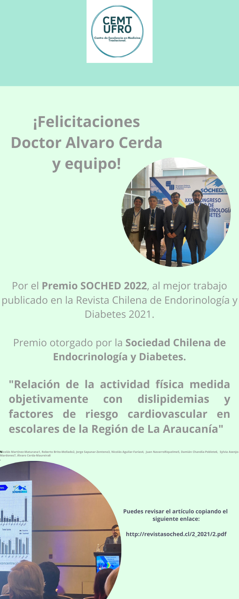 Felicitamos al Doctor Cerda y equipo por el reconocimiento otorgado por la Sociedad Chilena de Endogrinología y Diabetes, Premio SOCHED 2022, otorgado al mejor trabajo publicado en la revista Chilena de Endogrinología y Diabetes 2021.