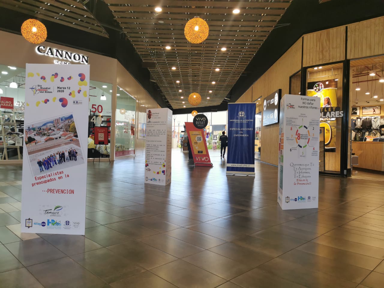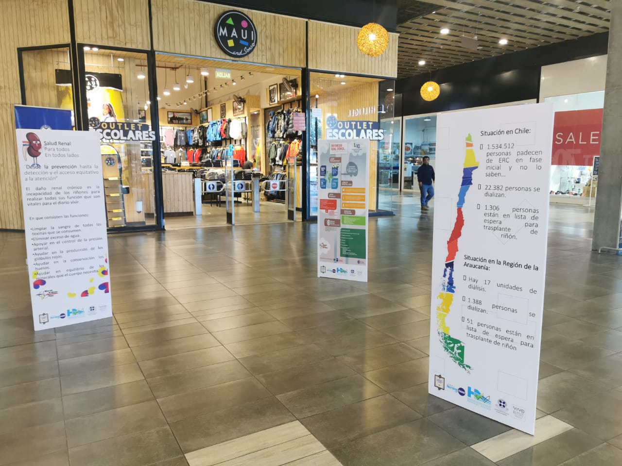 Con el propósito de visibilizar el día mundial del Riñón, el cuál es el día 12 de Marzo, las Enfermeras especialistas en Diálisis (Hemodiálisis y Peritoneodiálisis) en conjunto con la especialidad de Gestión del Cuidado en Personas con alteraciones renales de la Universidad de La Frontera, han decidido salir del Hospital Hernán Henríquez Aravena, realizando educación en forma pasiva a través de infografías en el mall VIVO OULET Temuco, lugar donde permanecerán hasta el próximo jueves 19 de marzo, para que así la comunidad pueda hacer una pausa y educarse en la prevención del daño Renal.