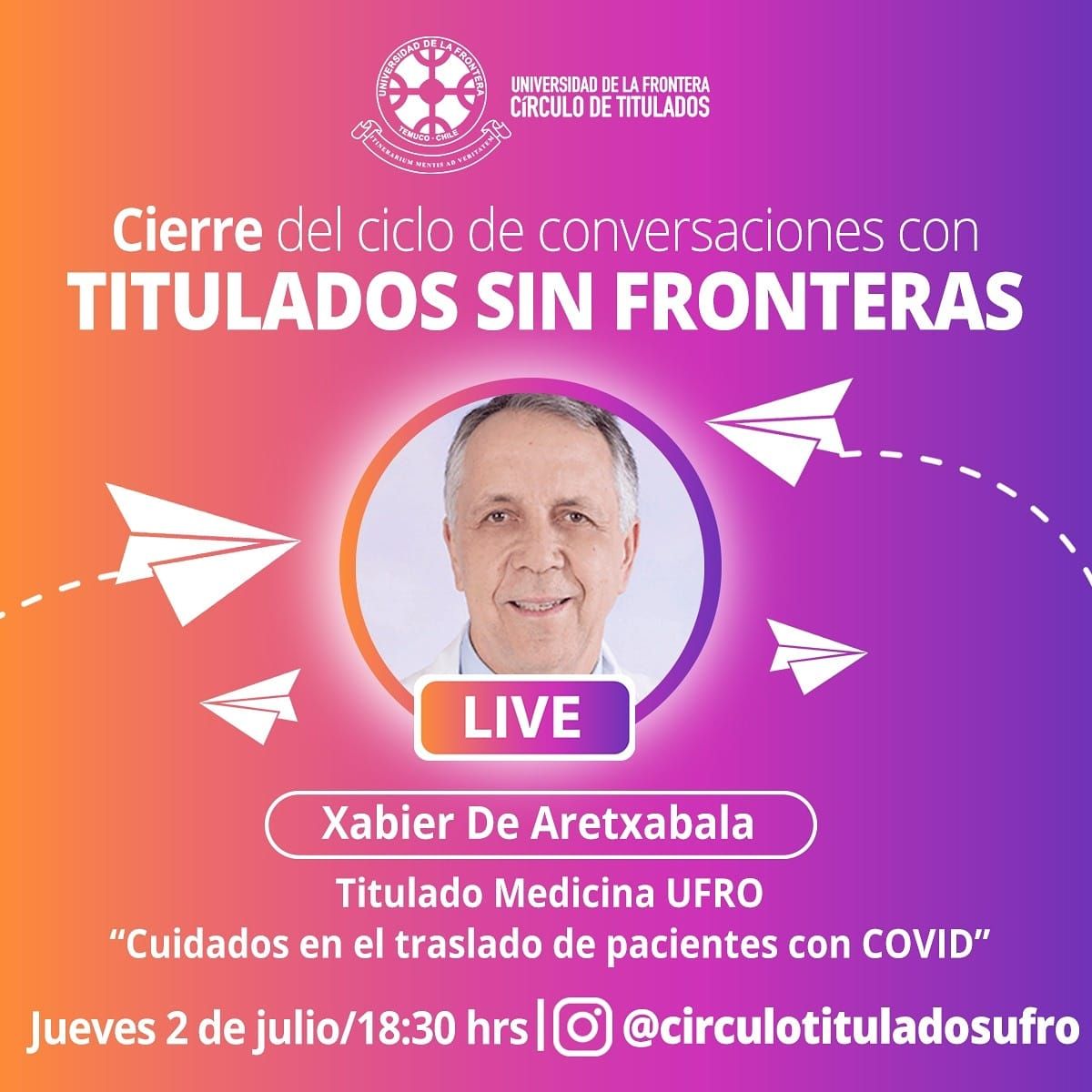 Cerramos este jueves nuestro primer ciclo de Conversatorios con “Titulados/as Sin Fronteras” nos acompañará Xabier De Aretxabala, titulado de Medicina UFRO, para compartirnos desde su experiencia sobre “Cuidados en el traslado de pacientes con Covid”.