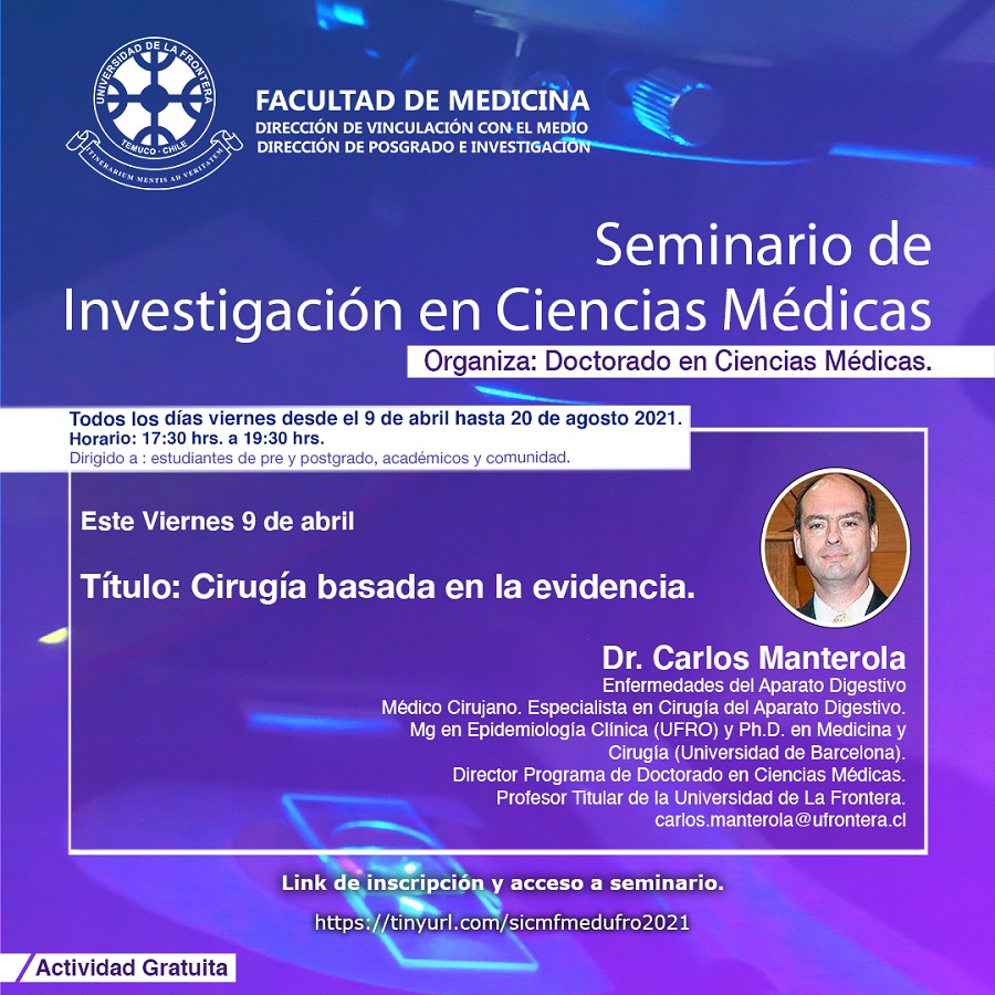 El Seminario de Investigación en Ciencias Médicas es una actividad organizada por el Doctorado en Ciencias Médicas de nuestra Facultad y está dirigida a la comunidad académica, estudiantes de pre y postgrado.