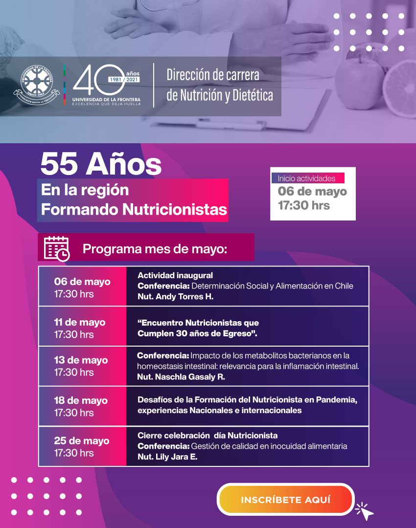 Este año en el marco que cumplimos 55 años formando Nutricionistas en la región, hemos querido realizar un programa durante el mes de mayo en el cual hay considerada una serie de actividades.