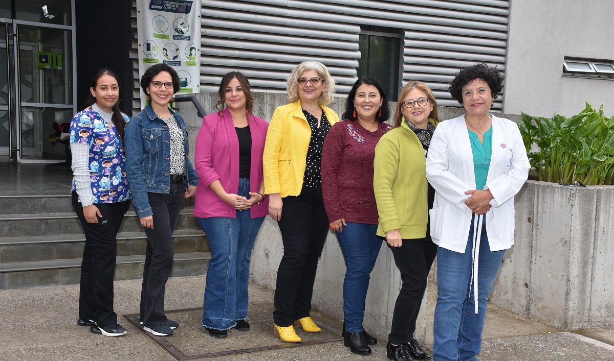 En la foto: Carmen Canales (TO enc. policlínico docente), Margarita Marilao (fonoaudióloga enc. gestión redes clínicas interdisciplinarias), Ana Cristina Sandoval (TO coordinadora vinculación con el medio), doctora Sandra Venegas, Fabiola Silva (médica familiar CIAN), Elly Aravena (educadora diferencial enc. redes comunitarias) y doctora Flery Fonseca (coordinadora de inv. y postgrado).