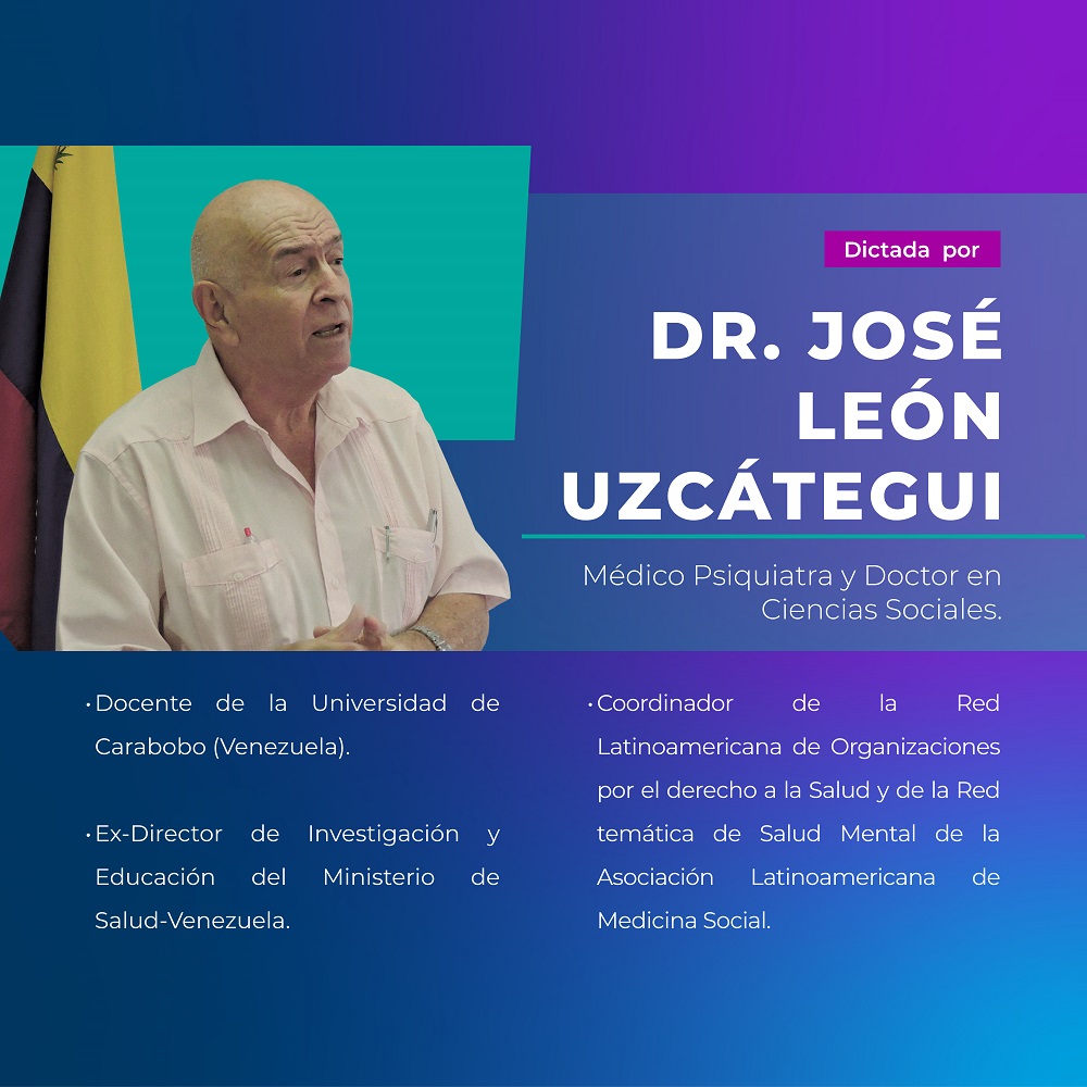 La Facultad de Medicina UFRO tiene el agrado de invitar a la cátedra abierta "Salud Mental Colectiva y Buen Vivir", dictada por el médico psiquiatra y doctor en Ciencias Sociales; docente de la Universidad de Carabobo (Venezuela); exdirector de Investigación y Educación del Ministerio de Salud de Venezuela; coordinador de la Red Latinoamericana de Organizaciones por el derecho a la Salud (LOMSODES) y de la Red temática de Salud Mental de la Asociación Latinoamericana de Medicina Social (ALAMES), Dr. José León Uzcátegui.