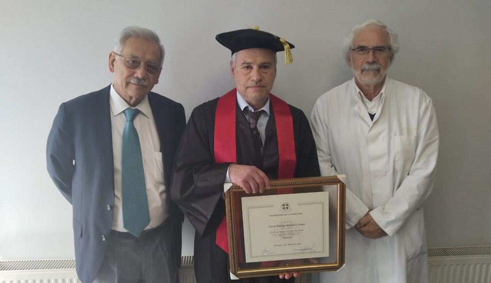 Entre los aspectos a los cuales apuntó el doctor Diener y donde se ejemplifica el trabajo de los doctores Sánchez y Hermosilla es “la especialidad de urología y andrología UFRO que tiene una duración de cuatro años por tener el componente andrológico y es una beca muy codiciada porque en Chile no es fácil tener esta formación. En ese sentido todas las personas que nos apoyado desde lejos y que conforman la diáspora chilena o la gente que no es chilena y que también nos ha apoyado se le reconoce. Esta es la trascendencia: cómo seguimos creciendo y no nos quedamos en los accidentes que nos ocurren circunstancialmente”.