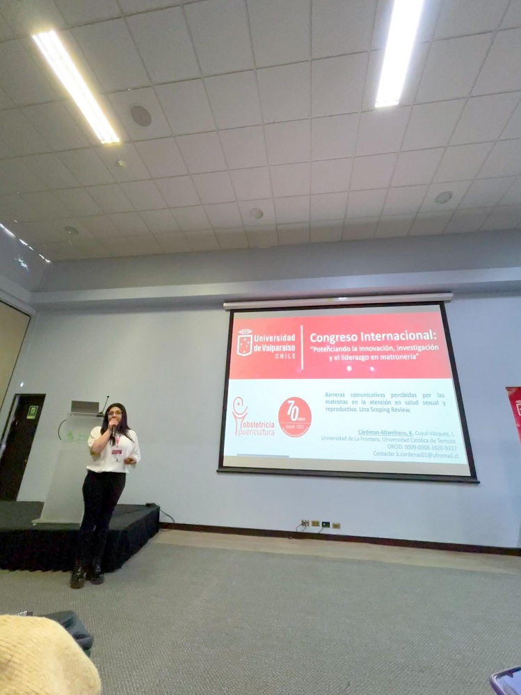 Katherine Cárdenas-Altamirano, estudiante de tercer año de Obstetricia y Puericultura en la Universidad de La Frontera (UFRO), participó activamente en el Congreso Internacional de Matronería celebrado este mes de agosto en la Universidad de Valparaíso, con la investigación: "Barreras comunicativas percibidas por las matronas en la atención de salud sexual y reproductiva. Una Scoping Review."